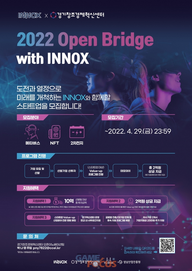 '2022 오픈 브릿지 위드 이녹스(2022 Open Bridge with INNOX)'는 경기혁신센터의 첫 전략 투자형 액셀러레이팅 프로그램이다.메타버스, NFT(대체 불가능한 토큰), 2차 전지사업 분야를 영위하거나 적용 가능한 기술을 보유한 기업이 참여 대상이다.