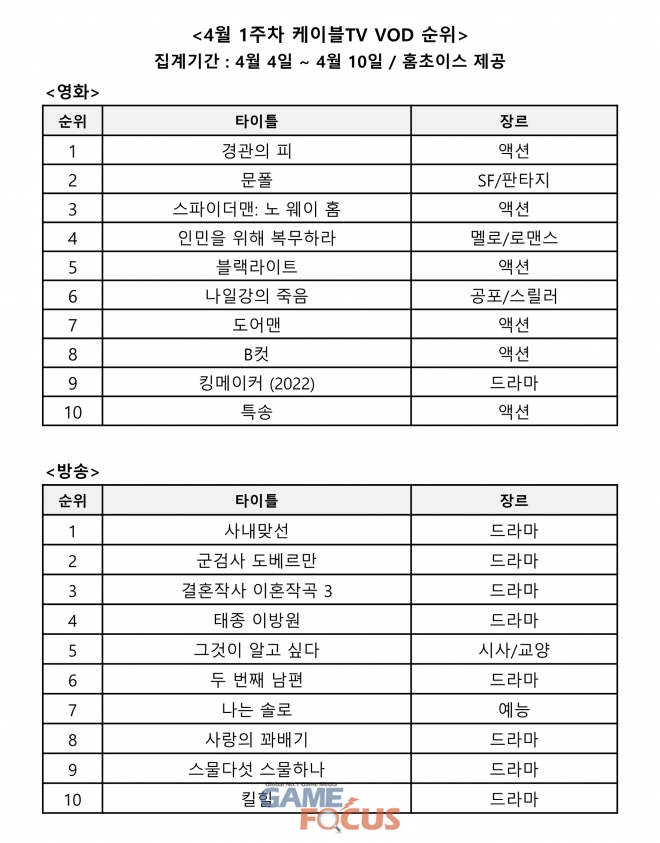 (주(홈초이스는 14일 LG헬로비전, Btv 케이블, 딜라이브, CMB, HCN 등 전국 케이블TV '4월 1주차 영화 · 방송 VOD 순위'를 발표했다.