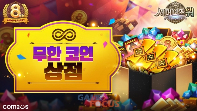 먼저 '8주년 기념 코인'으로 횟수 제한 없이 특정 아이템을 교환할 수 있는 '무한 코인 상점'이 열린다. 해당 코인을 사용해 신비의 소환서, 마나석, 에너지, 6성 영웅 등급 이상 룬 등 총 4종의 아이템을 무한정으로 획득할 수 있으며, '출시 8주년 기념 코인 상점'에서 다양한 아이템으로 교환 가능하다. 해당 코인의 누적 개수에 따라서도 최대 '초월의 소환서' 등 여러 아이템이 지급된다.