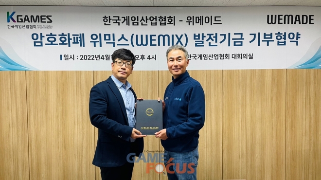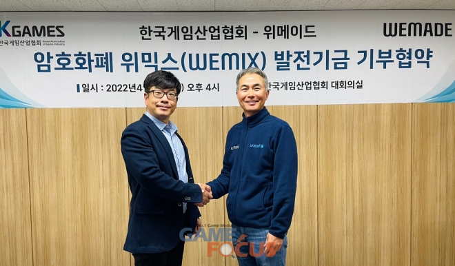 한국게임산업협회(협회장 강신철, 이하 K-GAMES)는 위메이드(대표 장현국)와 암호화폐 기부 협약식을 체결하고, 약 10억 원 상당의 암호화폐 '위믹스(WEMIX)'를 기부 받았다고 14일 밝혔다.