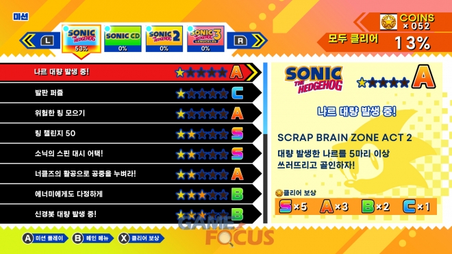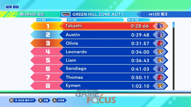 각 액트별로 자신의 베스트 클리어 타임 및 전 세계 플레이어의 랭킹을 볼 수 있다. 클리어 타임을 단축하여 상위 랭킹을 노려보자.