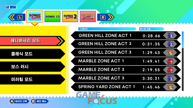 '애니버서리 모드'에서는 캐릭터를 '소닉', '테일즈', '너클즈' 중 선택하여 플레이할 수 있다.