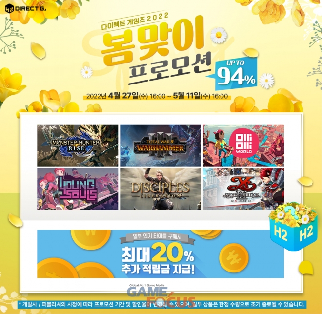 에이치투 인터렉티브(대표 허준하)가 디지털 유통 서비스인 다이렉트 게임즈에서 오늘(4월 27일)부터 봄맞이 프로모션과 이벤트를 진행한다.