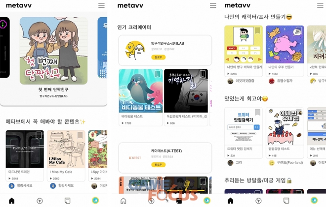 메타브는 3월 베타 서비스 오픈을 통해 300여 개의 메타 콘텐츠를 보유 중에 있다. 대표적인 크리에이터로는 유형테스트, 온라인 방탈출 등의 콘텐츠 제작사인 '방구석연구소'와 '케이테스트'를 비롯해 연말 SNS를 달군 '내 트리를 꾸며줘'를 개발한 '산타파이브'와 같은 팀/개인 단위의 개발 크리에이터들이 있다. 이 외에도 출판사, 스타트업, 공기관에 이르기까지 다양한 브랜드가 활동 중이다.