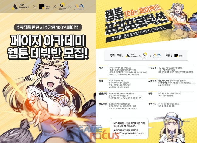 카카오엔터테인먼트(대표 이진수, 김성수)가 작가 양성 아카데미 '페이지 아카데미' 등과 함께 신진 작가 양성을 위한 인턴십 프로그램 '웹툰 프리프로덕션'을 진행한다. '수강료 100% 페이백' 혜택은 물론 작가 역량 준비부터 데뷔까지 지원하는 '올인원' 프로그램이다.