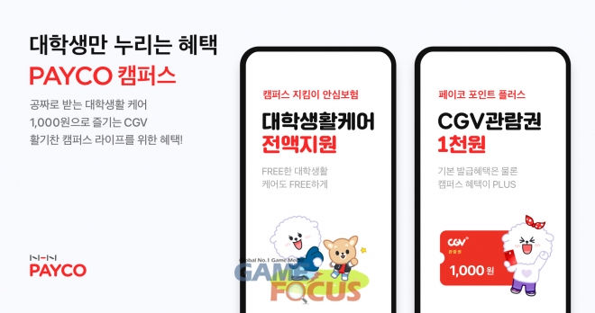 선착순 1만명 대상 CGV 관람권을 1,000원에 제공하는 혜택도 마련했다. 캠퍼스 인증 후 ‘페이코 포인트 플러스’ 실물 카드를 발급 받으면 CGV 할인 쿠폰이 즉시 지급되며, 5월 오프라인 이달의 가맹점에서 사용할 수 있는 1만원 상당의 쿠폰팩 및 페이코 5,000포인트를 함께 제공 받을 수 있다.