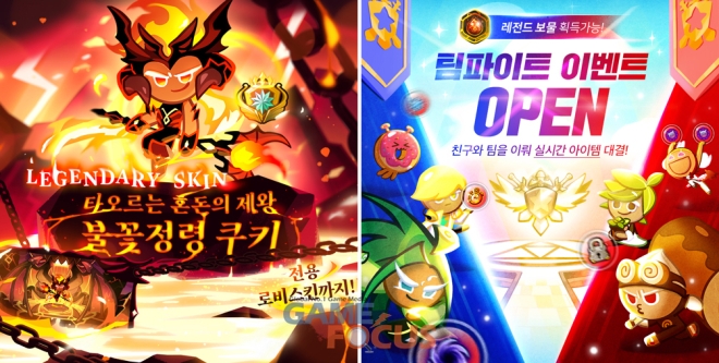 아울러 영웅 등급의 ▲타오르는 혼돈의 제왕 불꽃정령 쿠키와 함께 ▲태양을 가른 페페론치노맛 쿠키 ▲불을 머금은 새 크로우베리맛 쿠키 등 신규 스킨이 출시됐다. 또한 ▲화산에서 돌아온 용암전갈 ▲생명의 신비 콜리콜리 등 새로운 펫 스킨 2종과 ▲야생 콜리플라워 젤리 스킨 세트까지 만나볼 수 있다.