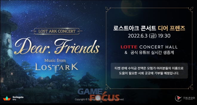 스마일게이트의 대표 IP 로스트아크가 3일 저녁 7시 30분부터 송파구에 위치한 1,200여석 규모의 ‘롯데 콘서트홀’에서 OST 콘서트 ‘디어 프렌즈(Dear. Friends)를 개최한다.