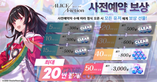 회사 측은 사전예약 이벤트로 신청 유저 수에 따라 정식 출시 후 게임 내에서 매력적으로 채색된 미소녀 영웅 캐릭터 20연속 뽑기분의 프리미엄 쿼츠 아이템을 지급하며, 현재 기준으로 전 세계 30만 명 달성에 성공함에 따라 정식 오픈 후 2,200쿼츠를 모든 유저에게 지급할 예정이라고 밝혔다.