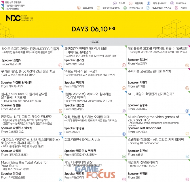 이 외에도 엔씨소프트, 에픽게임즈 코리아, 데브시스터즈, 엠바크 스튜디오, 원더피플 등 주요 게임사 종사자들이 참여해 완성도 높은 게임을 만들기 위한 최신 기술부터 게임업계 인재들의 커리어 성장을 위한 노하우까지 폭넓게 강연한다.