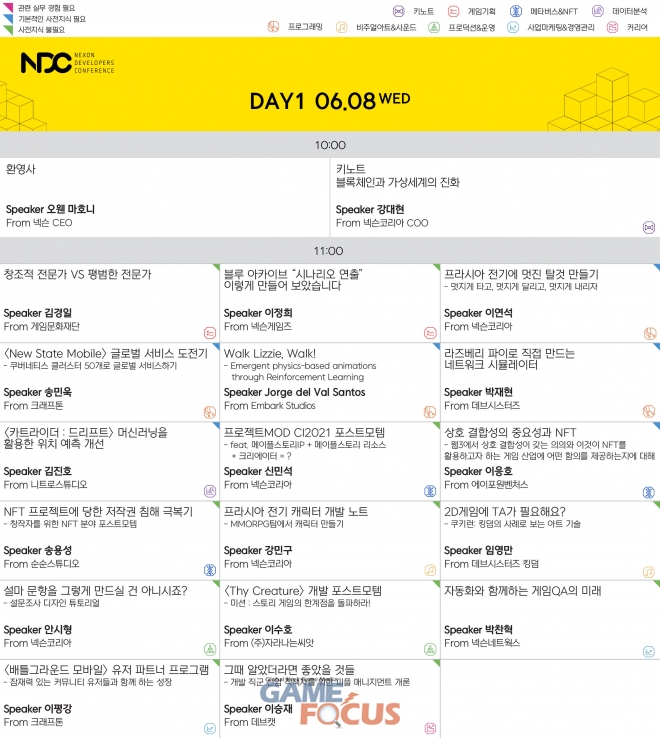 새롭게 추가된 메타버스&NFT 분야에서는 블록체인 전문가인 고려대학교 김승주 교수와 국내 메타버스 권위자 경희대학교 김상균 교수가 연사로 나서 게임의 발전 방향을 논의한다. 또한, 넥슨코리아 '프로젝트 MOD', 순순스튜디오 '스펌(SPUM)' 등 기업에서 관련 프로젝트를 진행하며 얻은 인사이트도 공유한다.