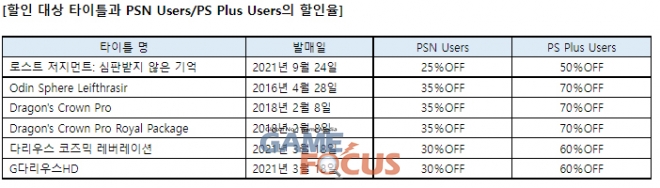 그 외 'Odin Sphere Leifthrasir''Dragon's Crown Pro''Dragon's Crown Pro Royal Package''다리우스 코즈믹 레버레이션''G다리우스HD'가 할인 대상이니 이번 세일을 꼭 이용해보자.
