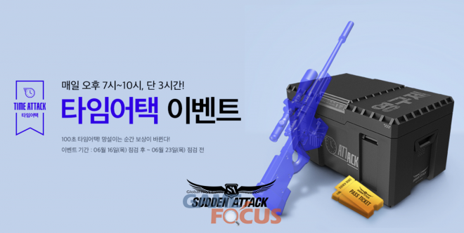 같은 기간, 매일 오후 7시부터 10시까지 ‘타임어택 이벤트’를 진행한다. ‘레그 좀비 캐릭터 영구제’, ‘윈체스터(IS) 마린 영구제’, ‘복돼지 캐릭터 영구제’ 등으로 이루어진 보상은 100초마다 변경되며, 원하는 보상이 나타나면 제한시간 내에 미션을 완료함으로써 얻을 수 있다.