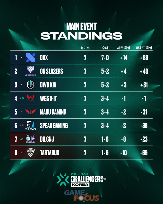 세트 득실이 -1인 WGS X-IT는 -2인 마루 게이밍과 스피어 게이밍을 제치고 4위를 차지했고 마루 게이밍과 스피어 게이밍은 세트 득실까지 같았기에 라운드 득실까지 계산한 끝에 마루 게이밍이 5위에 올랐다. 본선에 처음 출전했던 대전하나 CNJ와 타르타로스는 나란히 1승6패를 기록, 6강 플레이오프 진출이 좌절됐다.