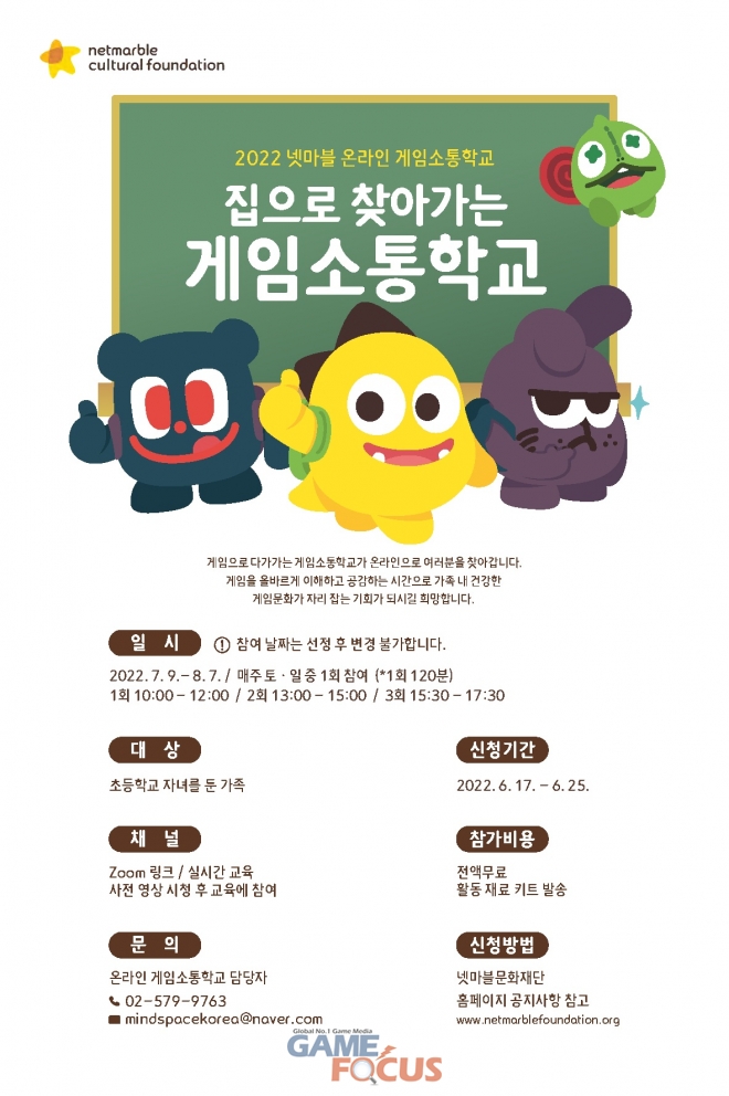 '게임소통학교'는 초등학교 자녀를 둔 가족은 누구나 신청 가능하며, 오는 6월 25일까지 넷마블문화재단 홈페이지 내 공지를 통해 등록하면 된다. 참가 비용은 전액 무료이며, 참가여부는 개별로 안내할 예정이다.