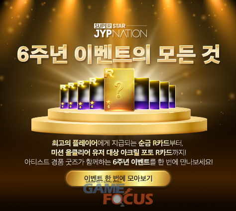 이번 6주년 기간에만 특별하게 업데이트되는 한정 테마 카드도 공개됐다. 이번 카드는 '슈퍼스타 JYPNATION' 출시 6주년을 기념해 이례적으로 기존과 다른 스폐셜 색상의 R로고가 담겼다. 이번 6주년 이벤트 기간 동안에만 제공되는 테마 카드인 만큼 유저들의 소장 욕구를 자극할 것으로 보인다.