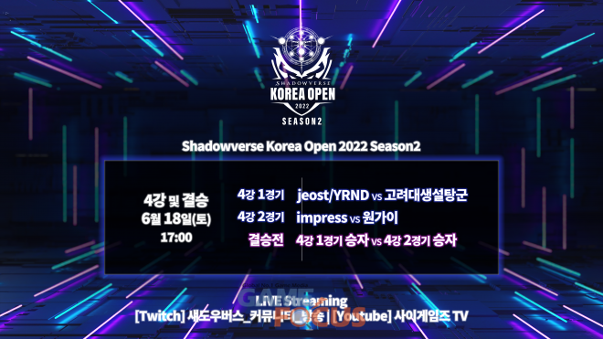 사이게임즈코리아(대표 와타나베 코우이치)가 후원하고 VSG TV가 주관하는 '섀도우버스 코리아 오픈 2022 시즌 2'가 오는 18일 17시부터 4강 1경기를 시작으로 결승전까지 최종일이 치러진다. 이번 시즌의 우승자에게는 우승 상금 500만 원과 연말 진행 예정인 '섀도우버스 코리아 오픈 2022 그랜드 파이널'의 초청권을 제공한다.