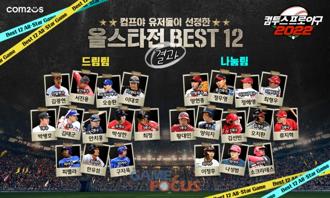 이번 설문 이벤트는 컴투스프로야구2022'(이하 컴프야2022) 공식 카페 유저들을 대상으로 지난 2주간 진행됐으며, 드림과 나눔으로 구분된 올스타 팀 각 포지션별 총 24명의 가상 베스트 라인업이 선정됐다.