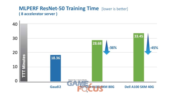 ResNet-50 모델의 경우, 가우디2는 엔비디아 A100-80G 제품 대비 학습 시간이 36% 단축됐다. 델(Dell)이 진행한 8개의 가속기 서버에서 진행한 ResNet-50 모델 및 BERT 모델 학습 테스트 결과 가우디2가 엔비디아 A100-40GB 대비 학습 시간을 45% 단축했다.