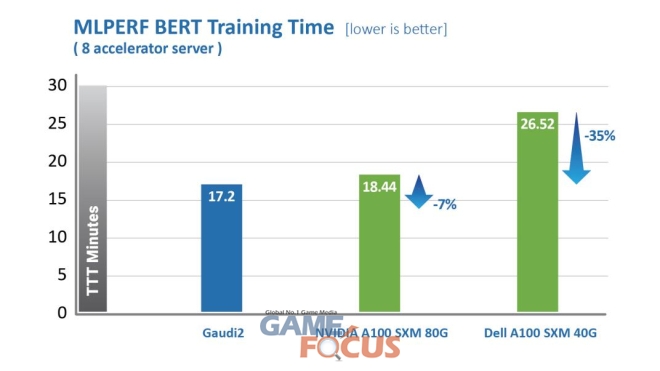 하바나 가우디2는 1세대 가우디 제품 대비 TTT 부문에 있어 획기적인 발전을 이루었다. 하바나 랩스는 지난 2022년 5월 진행한 MLPerf 벤치마크를 통해 가우디2가 8개의 가속기를 사용하는 비전 및 언어 모델에서 엔비디아 A100-80G 대비 월등한 성능을 기록했다고 밝혔다.