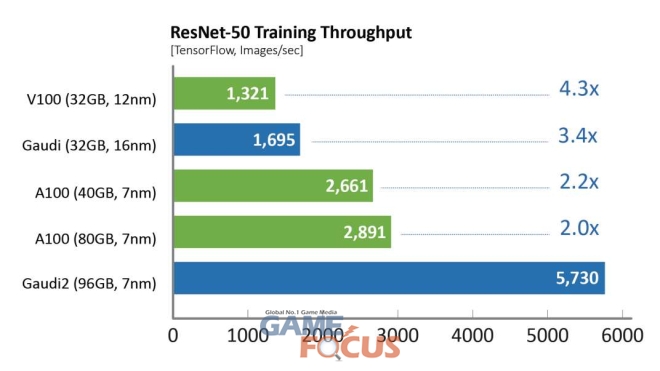 하바나 랩스는 8개의 GPU 서버 및 HLS-가우디2 레퍼런스 서버 상에서 가우디1 및 가우디2와 기존 상용 소프트웨어 간 성능을 비교했다. 학습 처리량은 NGC 및 하바나 공용 저장소의 텐서플로우 도커를 사용해 측정했으며, 제조사에서 권장하는 최고의 성능 매개 변수를 채택했다.