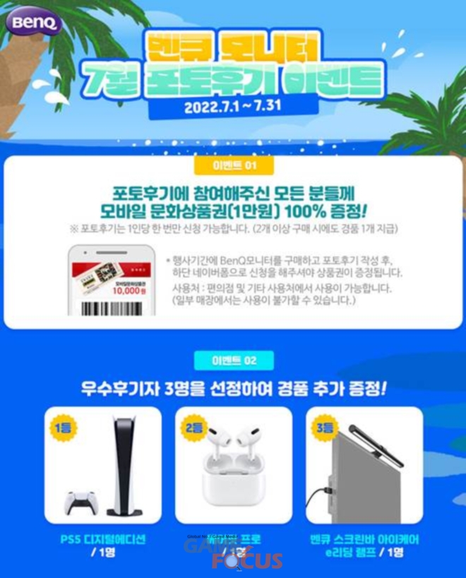 7월 한 달 간 진행되는 포토후기 이벤트는 벤큐 모니터를 구입하고 사진을 포함한 구매후기를 작성한 분들에게 모바일 문화상품권(1만원권)을 모두 증정하고, 우수후기자 3명을 선정하여 플레이스테이션5 디지털에디션과 애플 에어팟 프로, 눈이 편한 모니터조명 '벤큐 스크린바 아이케어 e리딩 램프'를 추가로 증정하는 행사이다.