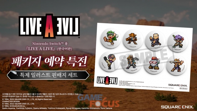 Nintendo Switch용 ‘LIVE A LIVE’(한국어판)의 패키지 예약 특전으로는 ‘특제 일러스트 핀배지 세트’를 증정한다.