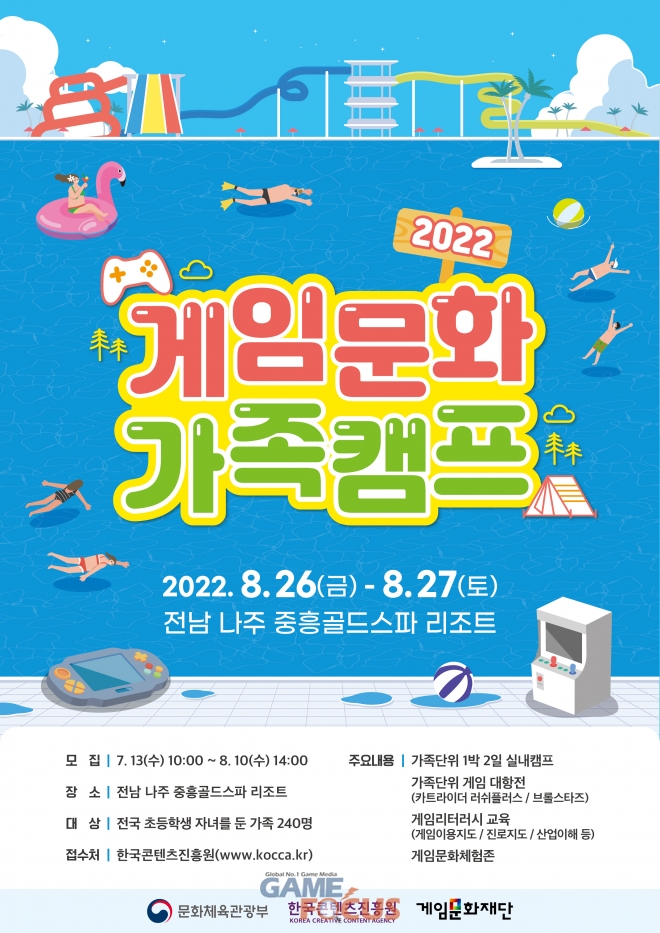 문화체육관광부와 한국콘텐츠진흥원, 게임문화재단이 온 가족이 함께 즐기는 건강한 게임문화 확산을 위해 1박 2일간 가족과 함께 다양한 게임 콘텐츠를 즐기는 ‘2022 게임문화 가족캠프(이하 캠프)’를 운영한다.