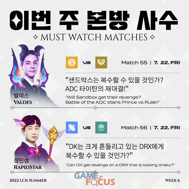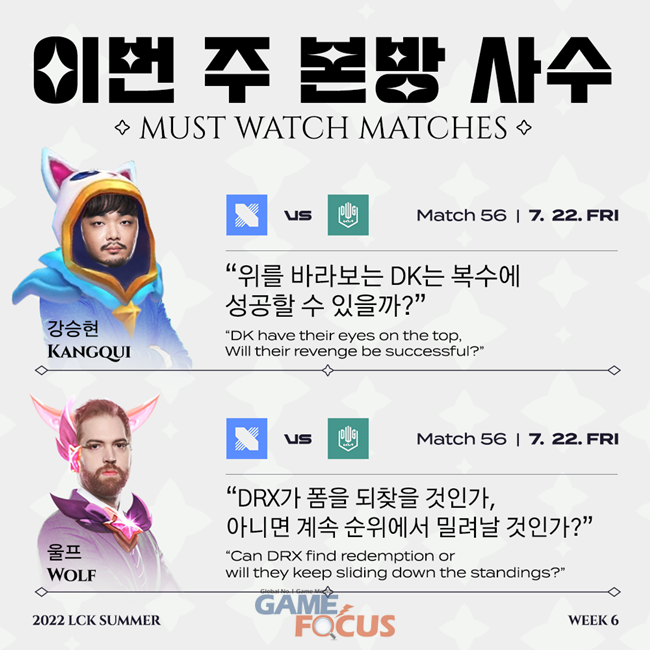 해설자들은 22일 열리는 DRX와 담원 기아의 대결을 꼭 봐야 할 경기로 뽑았다.