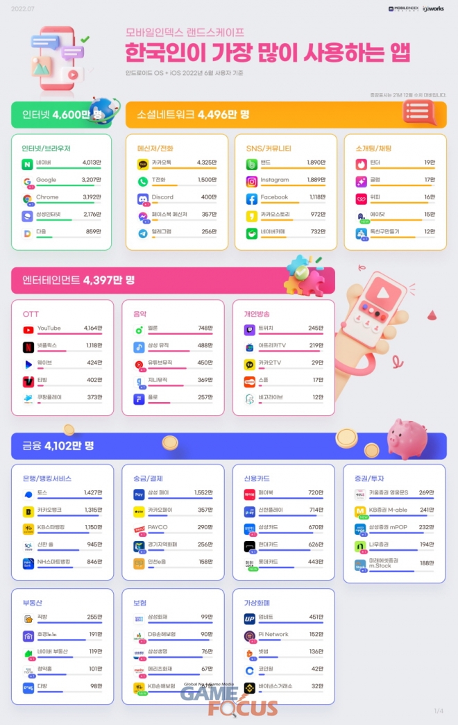 모바일 빅데이터 플랫폼 기업 아이지에이웍스가 자사의 데이터 분석 솔루션 ‘모바일인덱스’를 통해 <2022년 상반기 랜드스케이프> 리포트를 발표했다. 분석 기간은 2021년 12월 1일부터 2022년 6월 30일까지로, 일평균 4000만 모바일 기기의 20억건 데이터(안드로이드, iOS 통합 데이터 기준)를 AI 알고리즘에 기반하여 분석했다.