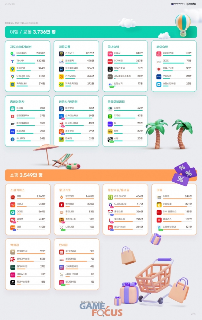 여행/교통, 쇼핑 업종 사용자 수