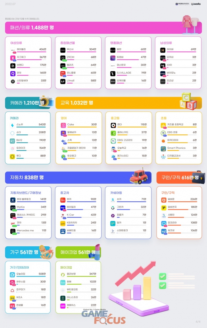 패션/의류, 카메라, 교육, 자동차, 구인/구직, 가구, 메이크업 업종 사용자 수