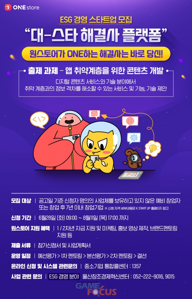 게임, 앱, 스토리콘텐츠 등 다양한 모바일 콘텐츠를 서비스하는 앱마켓 원스토어(주)(대표 이재환)가 국내 스타트업 지원을 위해 중소벤처기업부가 주관하는 '대-스타 해결사 플랫폼'의 'ESG경영' 분야에 과제 출제 기업으로 참여한다.
