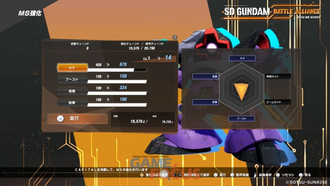 배틀 얼라이언스에서는 MS의 능력치를 강화하거나 강화 옵션이 달린 확장 파츠를 장비해 기체를 강하게 만들 수 있다. 마음에 든 기체를 강화해 자기만의 최강 기체를 만들자.