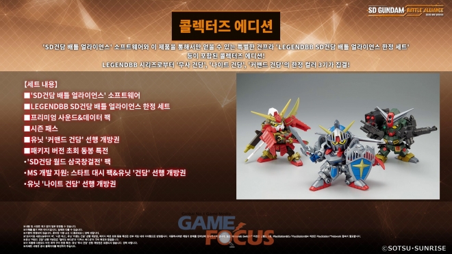 'SD건담 배틀 얼라이언스 콜렉터즈 에디션'을 통해서만 얻을 수 있는 특별한 건프라 'LEGENDBB SD건담 배틀 얼라이언스 한정 세트' 등이 포함된 콜렉터즈 에디션! LEGENDBB 시리즈로부터 '무사 건담', '나이트 건담', '커맨드 건담'의 한정 컬러 3기가 집결했다.