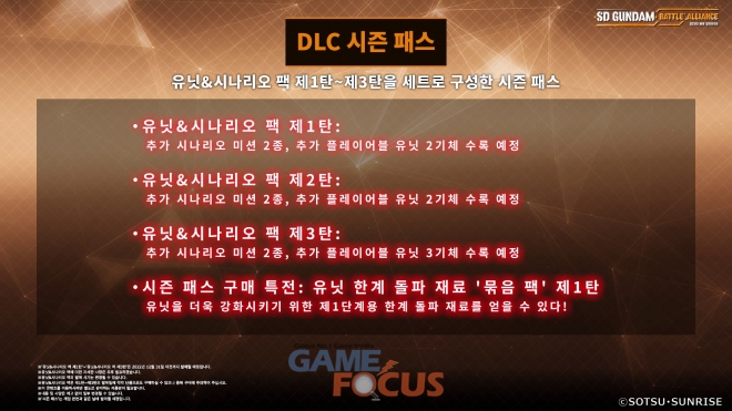 DLC '유닛&시나리오 팩'의 제1탄부터 제3탄을 세트로 구성한 시즌 패스가 등장! 시즌 패스 구매 특전으로 유닛 한계 돌파 소재 '묶음 팩' 제1탄이 제공된다.