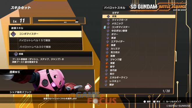 ‘파일럿 스킬'을 설정하면 기체를 강화하는 것만으로는 보완할 수 없는 특성을 향상시킬 수 있다. 미션에 참여해 파일럿으로서의 주인공의 경험치를 쌓아 레벨 업을 할 수 있다.