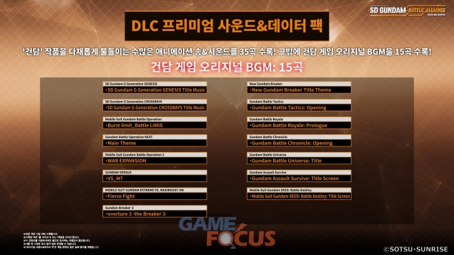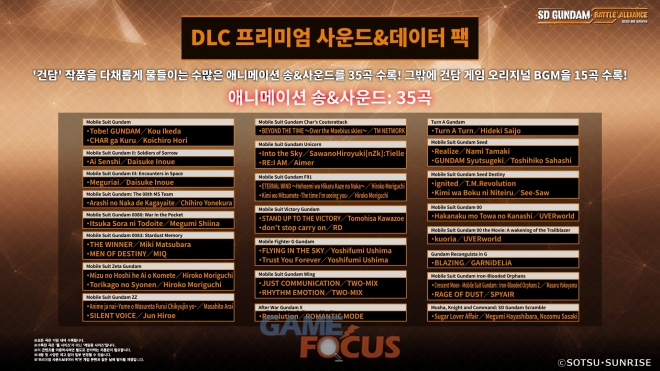 '건담' 작품을 다채롭게 물들이는 수많은 애니메이션 송&사운드 35곡 및 확장 파츠와 CAPITAL을 수록한 DLC 발매 결정! 건담 게임 오리지널 BGM도 15곡 수록된다.