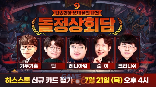 블리자드엔터테인먼트가 '하스스톤' 신규 확장팩 '나스리아 성채 살인 사건(Murder at Castle Nathria)'의 신규 카드들을 실력자 스트리머들과 함께 하나하나 살펴보고 그 가능성을 점쳐보는 ‘나스리아 성채 살인 사건 – 돌정상회담’ 카드 평가 방송을 오늘(21일) 낮 4시, 유튜브와 트위치 공식 채널을 통해 방송한다.