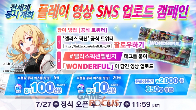 참여를 희망하는 유저는 패널을 많이 이어 나가면 시원시원한 타격감이 전달되는 '원더플(WONDERFUL)' 문구가 담긴 영상을 게임 공식 트위터 또는 카페에 업로드하면 추첨을 통해 캐릭터 가챠 100연속 뽑기 진행이 가능한 프리미엄 쿼츠 아이템 3만 개를 총 5명에게 증정한다.