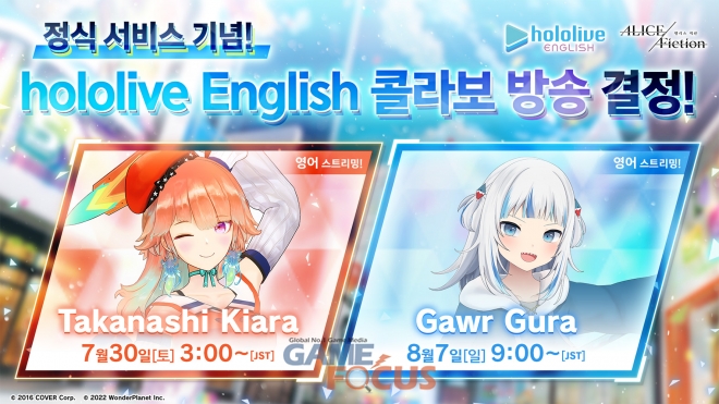 홀로라이브 잉글리쉬 측에서는 100만 명의 구독자를 갖춘 다카나시 키아라(Takanashi Kiara)와 164만 명의 구독자를 보유한 가우르 구라(Gawr Gura) 등 인기 버튜버가 총출동하며, 이들은 7월 30일과 8월 7일 각자의 방송 채널에서 앨리스 픽션의 체험을 포함한 커뮤니티에 집중할 방침이다.