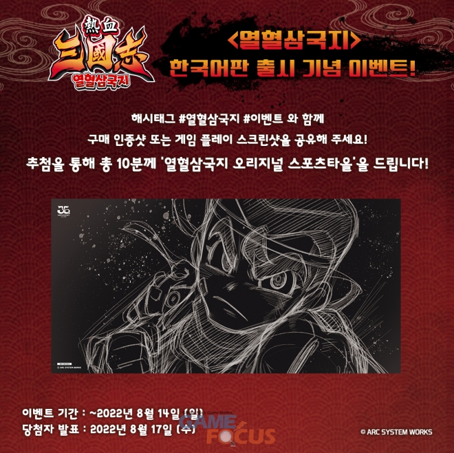 - 아크시스템웍스 아시아지점 공식 페이스북 이벤트 안내 게시글에 해시태그 #열혈삼국지 #이벤트 를 기입하여 댓글로 참여