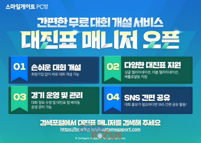 스마일게이트 메가포트 여병국 팀장은 “스마일게이트PC방과 함께 해주시는 가맹점주 여러분들이 힘을 내실 수 있도록 작은 이벤트를 준비했다. 누구나 간편하게 게임 대회를 개설하고 관리할 수 있는 ‘대진표 매니저’에도 많은 관심을 부탁 드린다.”고 소감을 전했다.