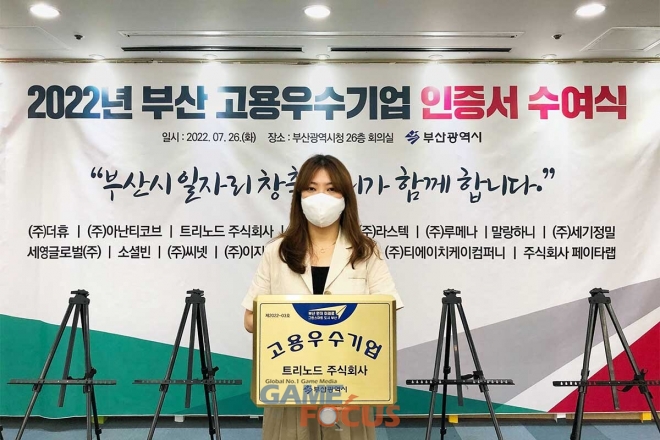 게임 개발사 트리노드는 코로나 19로 이어진 장기 불황 속에서도 부산시 일자리 창출에 대한 기여를 인정받아 부산시로부터 '2022 고용 우수 기업'으로 선정되었다고 27일 밝혔다.