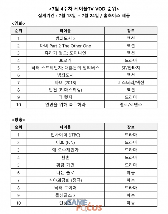 (주)홈초이스는 27일 LG헬로비전, Btv 케이블, 딜라이브, CMB, HCN 등 전국 케이블TV '7월 4주차 영화 · 방송 VOD 순위'를 발표했다.