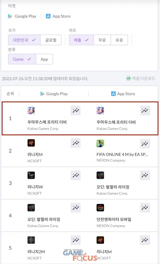 (주)카카오게임즈(대표 조계현)는 (주)사이게임즈(대표 와타나베 코우이치)가 개발한 모바일게임 '우마무스메 프리티 더비'가 구글 플레이 및 애플 앱스토어 매출 순위 1위를 차지했다고 27일 밝혔다.
