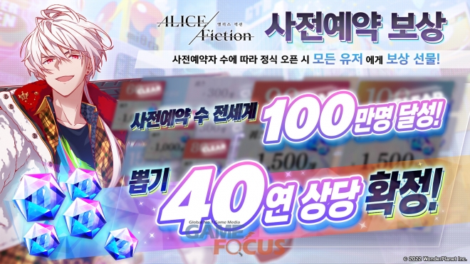 원더플래닛 측은 앨리스 픽션의 정식 서비스를 기념하고, 국내 유저들에게 진정성을 전달하고자 다채로운 이벤트를 진행한다. 우선, 전 세계 사전예약 신청자 수 100만 명 달성을 기념해 정식 오픈과 동시에 캐릭터 뽑기를 40연속 진행할 수 있는 쿼츠 아이템 12,000개를 모든 유저에게 지급한다.