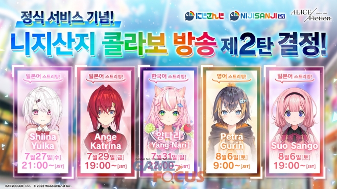 이 밖에 미소녀 서브컬처 마니아층을 겨냥해 버튜버 콜라버레이션 방송 2탄도 오늘부터 차례대로 진행된다. 이번 생방송 2탄에 참여하는 버튜버는 구독자 59만 명의 시이나 유이카(Shiina Yuika)를 시작으로, 7월 29일 '안쥬 카트리나', 그리고 국내 유저들을 겨냥해 7월 31일에는 인기 버튜버 '양나리(Yang Nari)'가 앨리스 픽션을 체험하며 유저들과 소통할 계획이다.