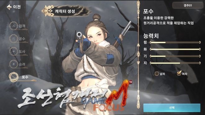 '조선협객전M'에서 처음으로 추가되는 직업인 '포수'는 공격 속도보다는 화력에 집중한 클래스로, 월등한 사거리를 자랑하며, PvP, PvE에서도 상황에 맞는 특수 탄환을 사용할 수 있다. 특수 탄환에는 '폭발 탄환', '절멸 탄환', '금강 탄환' 등이 있으며, '조준 사격'과 '사격 요청' 등 포수만의 독특한 공격 방식도 존재한다.