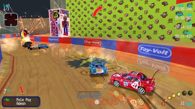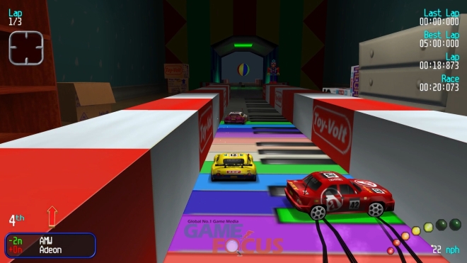 자동차는 실제 R/C 카의 크기이기 때문에 트랙 주변에서 발견되는 물체는 실물보다 크다. 연석은 거대한 벽이 되고, 장난감은 장애물이 된다. 자동차를 몰고, 통과하여, 결승선에 도달하기까지 모든 것이 공평하다.
